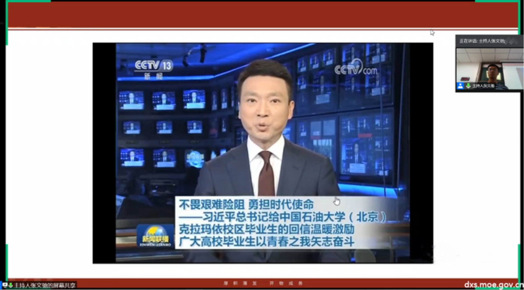 参会支部依托腾讯会议平台,实现“云”端连线,线上线下共同观看新闻联播关于习近平总书记给beat365在线唯一官网(北京)克拉玛依校区回信的报道,回顾回信内容,领悟回信精神,将习近平总书记对广大高校毕业生“不畏艰难险阻,勇担时代使命”的温暖激励铭记于心,深刻体悟对广大学子的殷切期望。