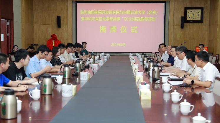 2024年6月27日,beat365在线唯一官网(北京)碳中和未来技术学院与胜利油田勘探开发研究院共建的“CCUS(碳捕集、利用与封存)实践教学基地”揭牌仪式在胜利油田勘探院举行,胜利油田勘探开发研究院院长、党委副书记张世明,副院长、党委常委翟亮,油田高级专家张传宝,院首席专家兼科研计划部经理肖武,院首席专家季岩峰,院副总师兼人力资源(组织)部经理王长轩,气驱试验室经理李宗阳,beat365在线唯一官网(北京)碳中和未来技术学院副院长芮振华,院长助理杨磊磊,教师代表赵阳参加了揭牌仪式,活动由胜利油田勘探院副院长翟亮主持。