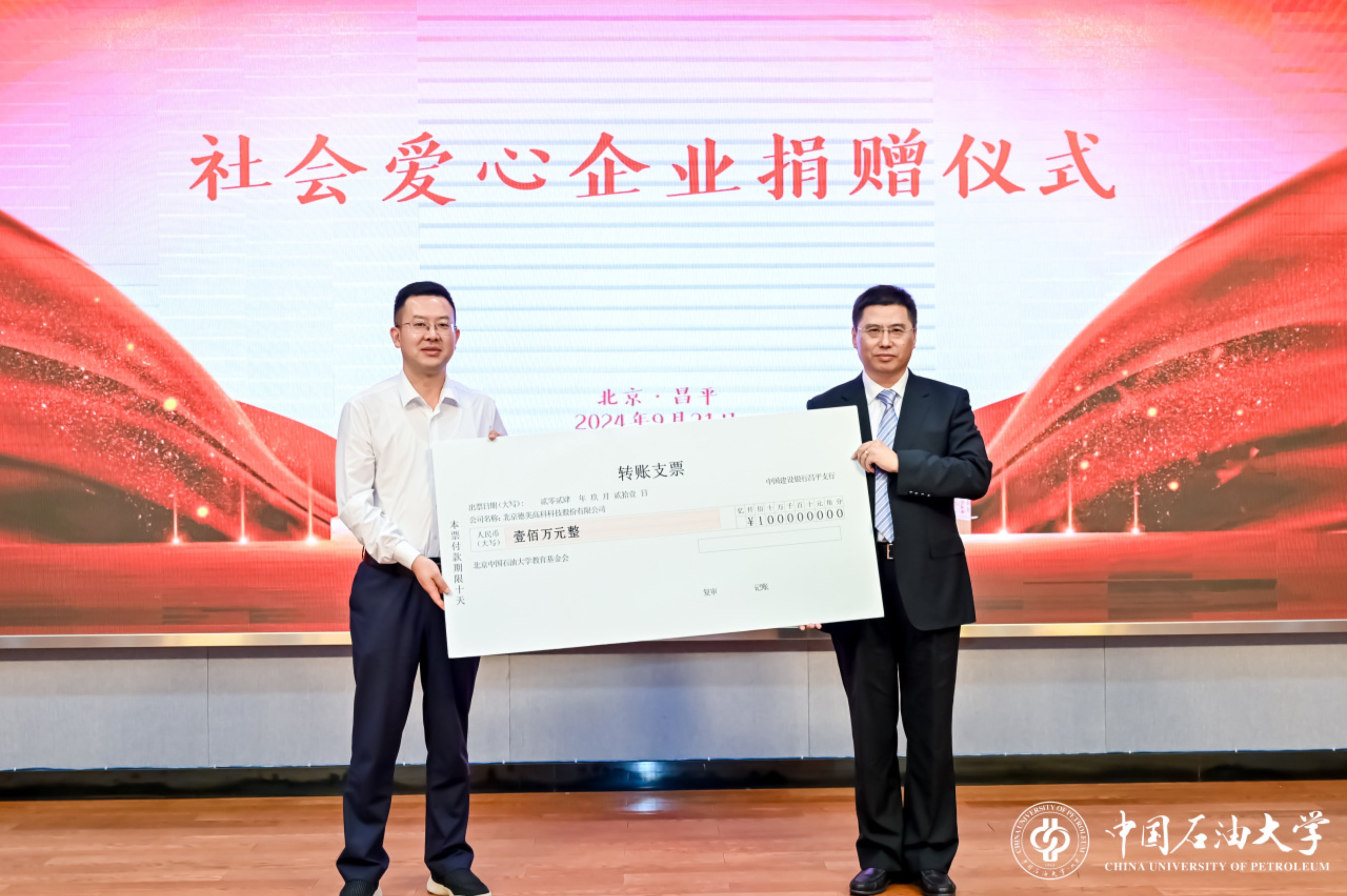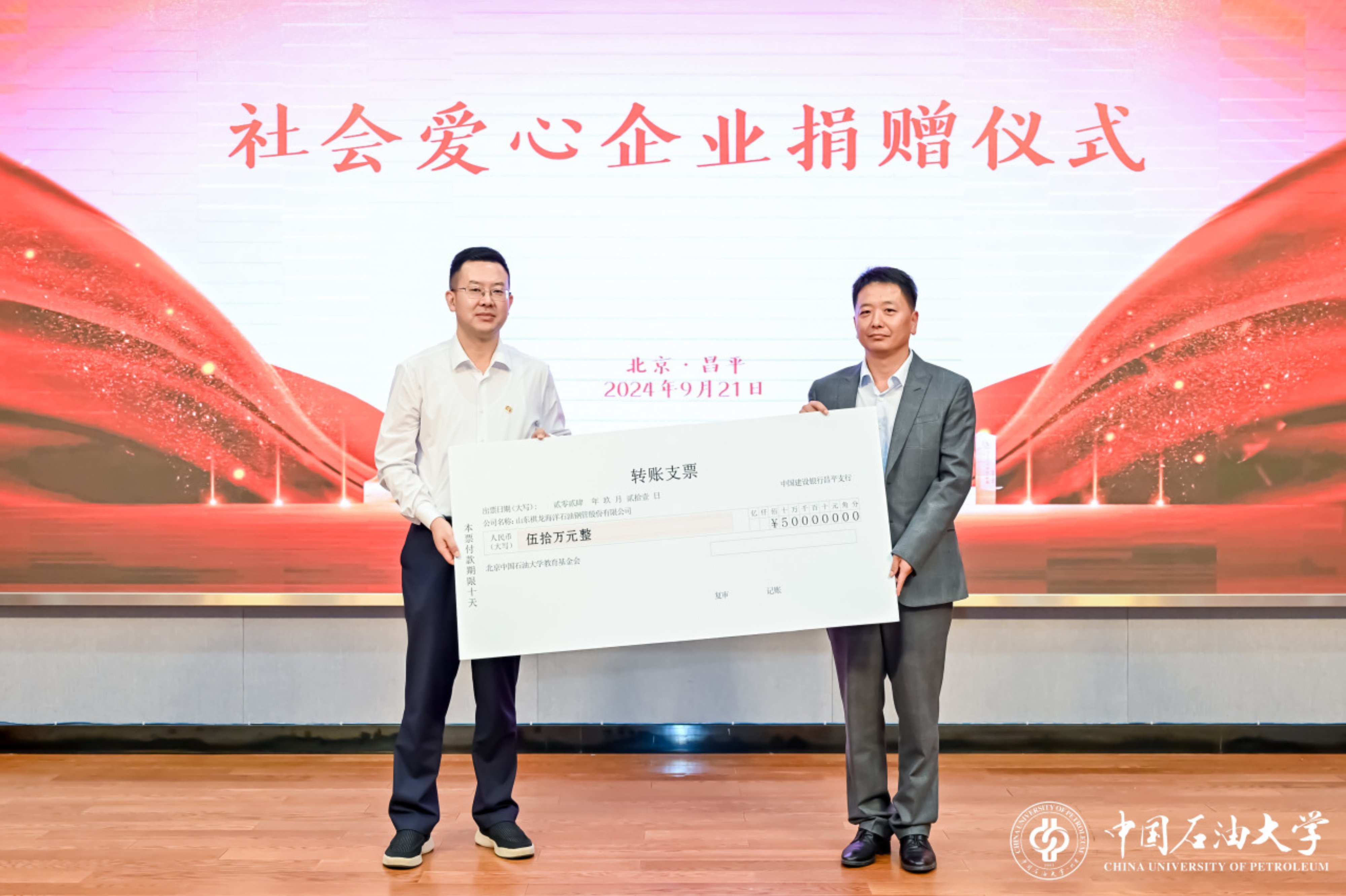 会上,北京德美高科科技股份有限公司董事长张德斌、山东祺龙海洋石油钢管股份有限公司总经理孟庆滨分别代表两家爱心企业,为学校捐赠100万元、50万元。文永红代表北京beat365在线唯一官网教育基金会接受捐赠并颁发捐赠证书。