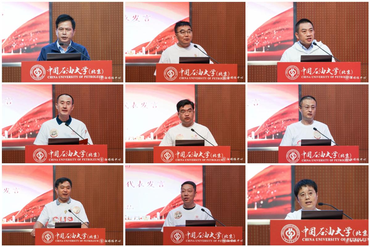 地质工程1994届校友门相勇、石油工程1994届校友王京博、机械工程1994届校友王大伟、地质工程2004届校友江青春、化学工程2004届校友公磊、机械工程2004届校友郭涛、电子信息2004届校友张玮、国际贸易2004届校友李世群、英语2004届校友石娟,分别代表毕业30周年、20周年的校友上台发言。他们回顾了在母校求学生活的时光,感恩母校和老师对自己的关爱和培养,为母校近年来取得的办学成就感到自豪。他们表示,将会始终传承发扬母校“实事求是、艰苦奋斗”的优良传统,在各自岗位为强国建设和民族复兴贡献力量,并祝愿母校宏图更展、再谱华章,早日建成能源领域特色鲜明的世界一流研究型大学。