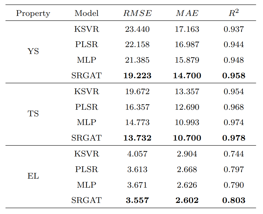 传统模型与本文方法的各项回归评价指标比较如表1所示,其中每个MP的软测量结果为5次重复的平均值。一般R2越大,RMSE越小,MAE越小,说明预测越准确。很明显,所提出的SRGAT在RMSE、MAE和R2方面优于其他三种方法,证明了其优越性。此外,除了MLP在EL上的表现略逊于PLSR,在大多数情况下,包括SRGAT和MLP在内的基于神经网络的方法在HSMP的MP软测量中比传统回归具有优势。