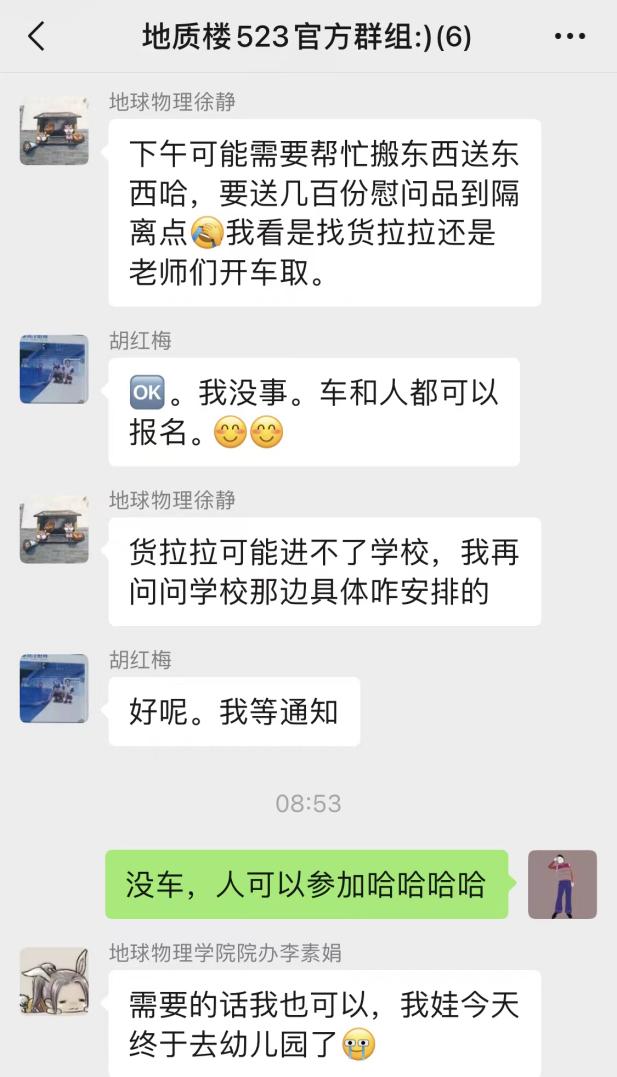 面对社会捐赠的物资,徐静团结带领院办职员、部分教师一起打包运送,20余人快速完成打包,第一时间送到隔离酒店,让学生能够第一时间领取到慰问品。在地球物理学院和安全学院志愿者老师们的共同努力下,圆满完成温都水城湖湾酒店、乐多港万豪酒店、且亭山水酒店3个隔离点275人慰问品的发放。得知有位学生房间号不在名单里因此没有收到慰问品,徐静立即联系闪送加急派送了一份,她就是这样一位老师,时刻把学生放心上,用心用情解决学生的问题。