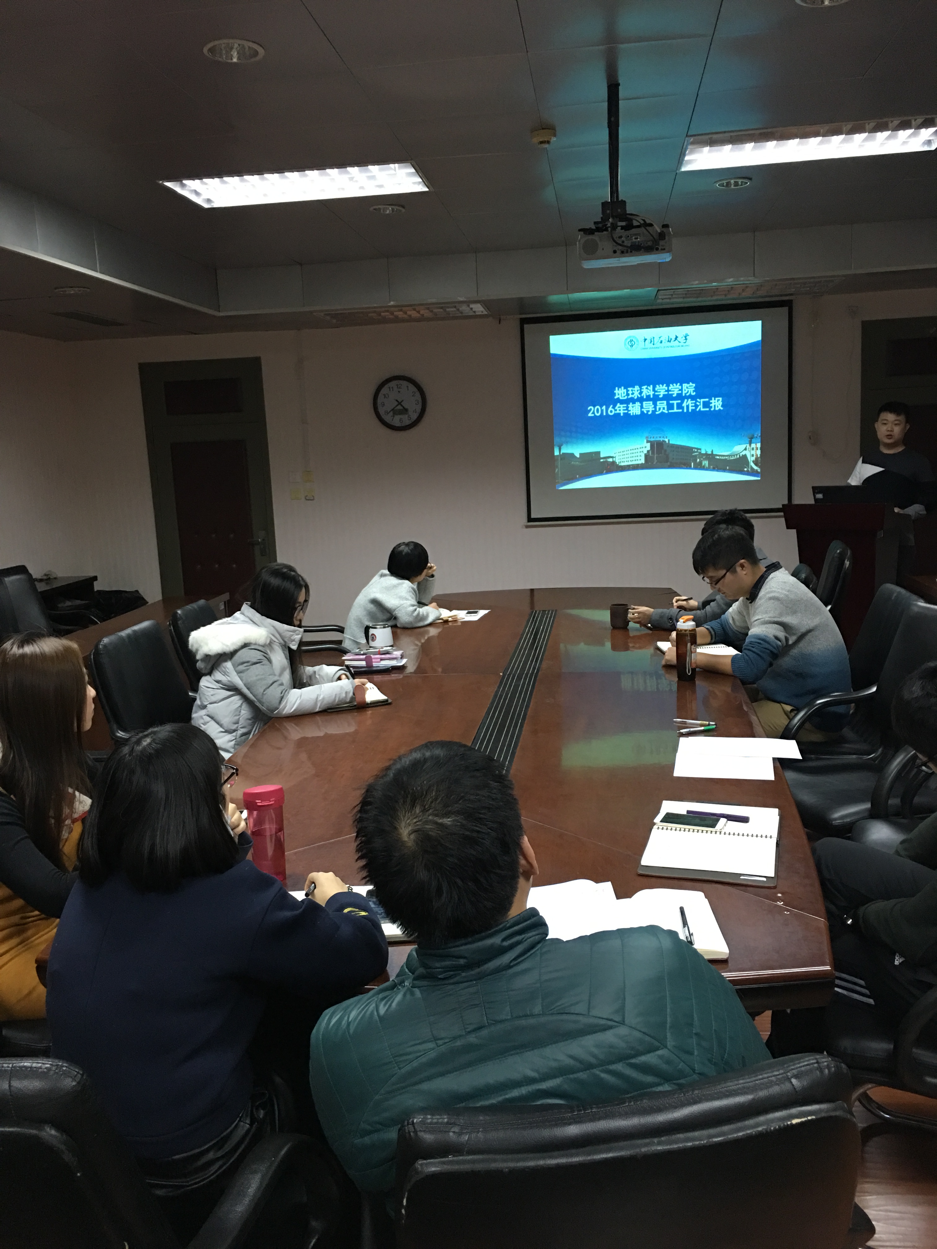 在汇报的过程中,各位辅导员梳理了一年来自身工作的重点,找到了工作中存在的不足,阐述了克服困难的方法并对新一年的工作重点和目标进行展望。从党建室的建成到李四光奖颁奖典礼、第一届全国油气地质大赛等等活动都饱含着地学院辅导员团队的辛勤付出和精心筹划,大家纷纷表示在本年度的辅导员工作中得到了收获和成长。