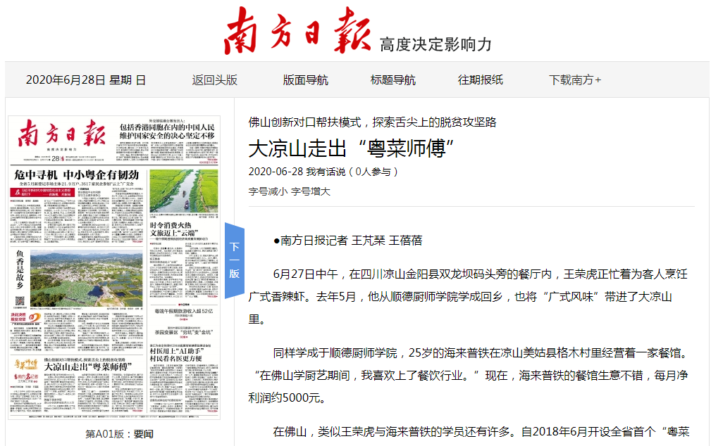 6月28日,《南方日报》头版推出报道《佛山创新对口帮扶大凉山走出“粤菜师傅”》,对太阳官网以“粤菜师傅”工程为突破口,创新对口帮扶,探索舌尖上的脱贫攻坚方案进行了深度关注。