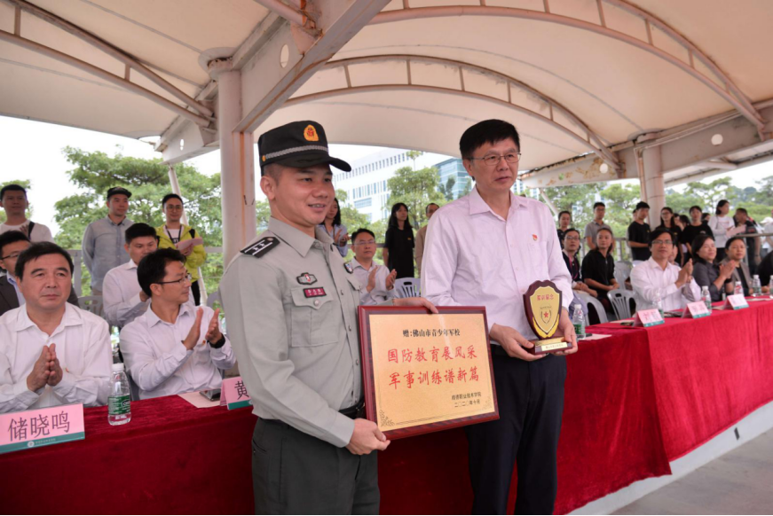 李先祥书记作总结讲话,希望同学们心怀家国、热爱劳动、坚持锻炼、培养自律,并向佛山市青少年军校赠送牌匾,感谢他们对学校军训工作的大力支持。