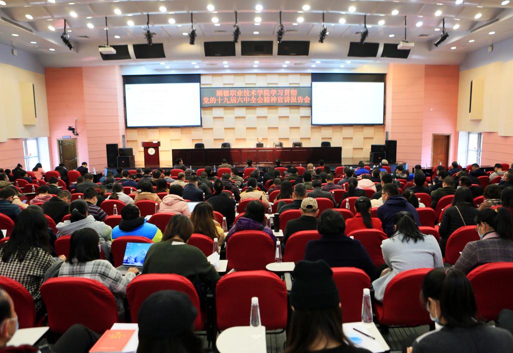 为深入学习贯彻党的十九届六中全会精神,推动党史学习教育深入开展,12月29日下午,学校举行学习贯彻党的十九届六中全会精神宣讲报告会,邀请顺德区党史学习教育宣讲团成员、区社科联主席沈涌作主题为《高举旗帜,继续前进——党的十九届六中全会精神宣讲》的辅导报告。学校党政领导班子成员、全体教职工参加报告会。