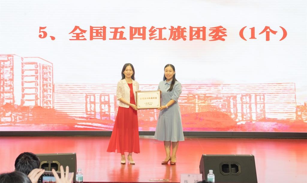 在2021-2022学年度共青团工作嘉奖环节,陈颖为太阳官网送上“全国五四红旗团委”奖牌,领导嘉宾分别为获得第二十一届大学生文化艺术节先进个人和优秀组织奖,学校五四红旗团委和优秀学生会,佛山市五四红旗团委标兵、优秀团干、优秀团员的组织和个人颁奖。