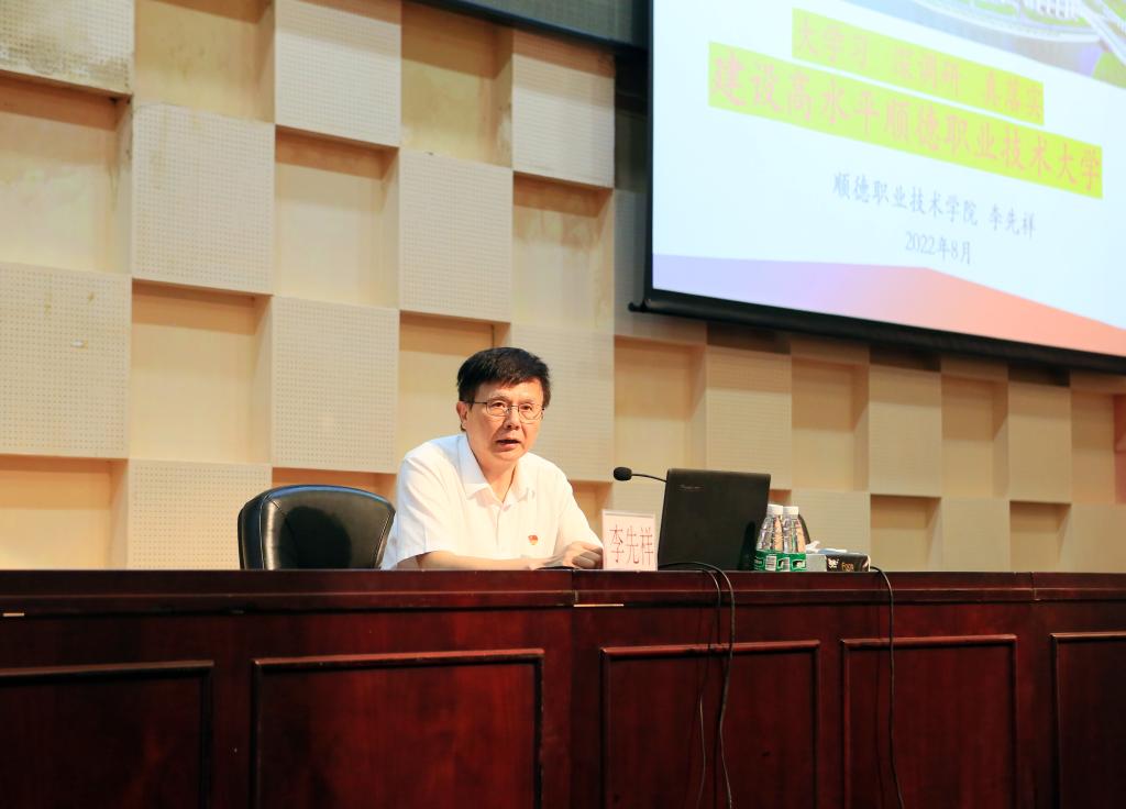 李先祥作《大学习 深调研 真落实 建设高水平顺德职业技术大学》专题辅导报告。他指出,做好管理工作,要坚持大学习、深调研、真落实,落实好十个方面要求,正确处理好“谋与干”“内与外”“长与短”“远与近”“点与面”“横与纵”“硬与软”“急与缓”“新与老”“进与稳”十大关系。李先祥强调,要深入学习贯彻习近平总书记在中央党校(国家行政学院)中青年干部培训班开班式上的讲话精神,筑牢理想信念根基,守住拒腐防变防线,树立和践行正确政绩观,练就过硬本领,为学校建设发展作出新的更大贡献。
