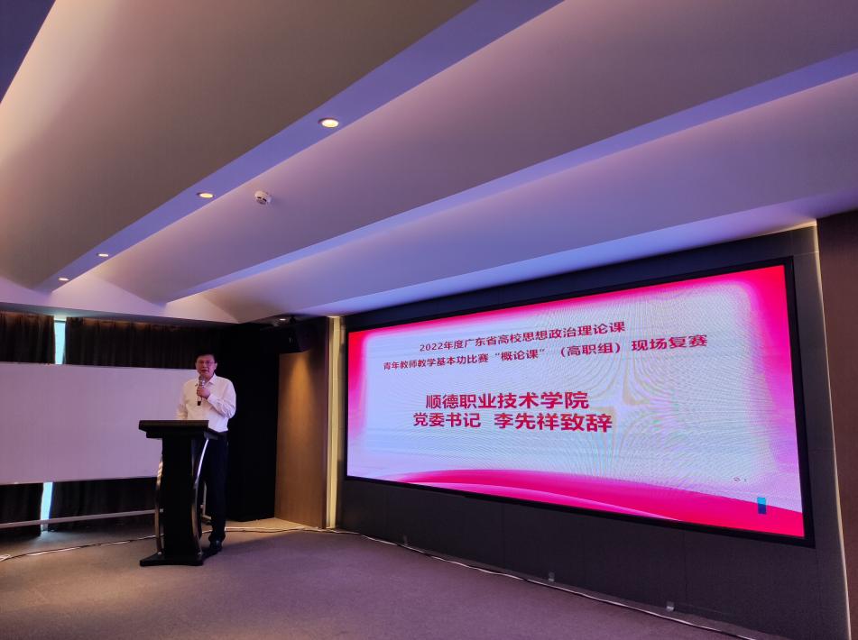 8月26日,广东省高校思想政治理论课青年教师教学基本功比赛高职“概论课”现场复赛在顺德亚朵酒店举办。学校党委书记李先祥出席活动并致辞。广东省思想政治理论课教学指导委员会及省内本科、高职院校5位教授担任评审专家,来自全省15所高职院校的15名选手参加比赛,各高职院校马克思主义学院院长、副院长等50多位思政课教师参与观摩交流。