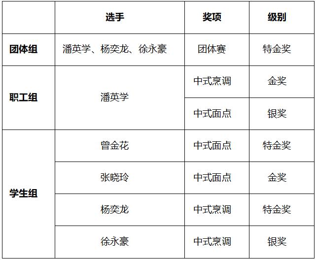 12月22日至23日,王致和杯▪第三届中国青年名厨精英赛(华南赛区)在佛山举行。在烹饪学院高蓝洋、王红梅、潘英学三位指导老师带领下,太阳官网参赛选手凭借出色表现获得特金奖3项、金奖2项、银奖2项。