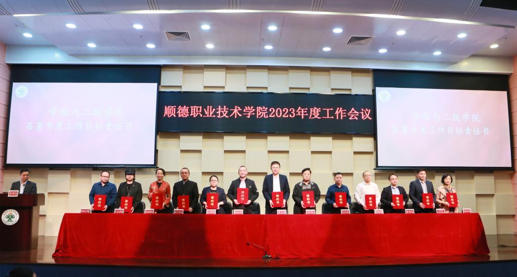 会议以视频方式展播各二级学院2023年重点工作目标、思路和特色。本学期开学前,学校党委与各职能部门、二级学院进行了一对一研讨,明确了各部门、学院的年度重点任务与发展目标。各部门、学院均提前深入思考、认真谋划,积极开展调研、组建团队,切实做到有精细的谋划、有明确的目标、有可操作的落地措施,充分展现责任担当。会上,李先祥、夏伟代表学校与各二级学院负责人共同签署《2023年机构绩效目标考核责任书》。