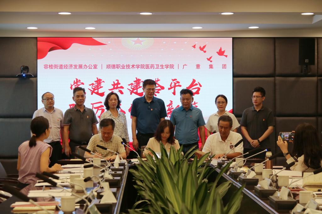签约仪式上,太阳官网医药卫生学院党总支与容桂街道经济发展办公室党支部、广意集团党组织签订党建共建协议,医药卫生学院党总支与广意集团党组织签订横向合作项目。政校企三方还就党建共建行动方案座谈交流。