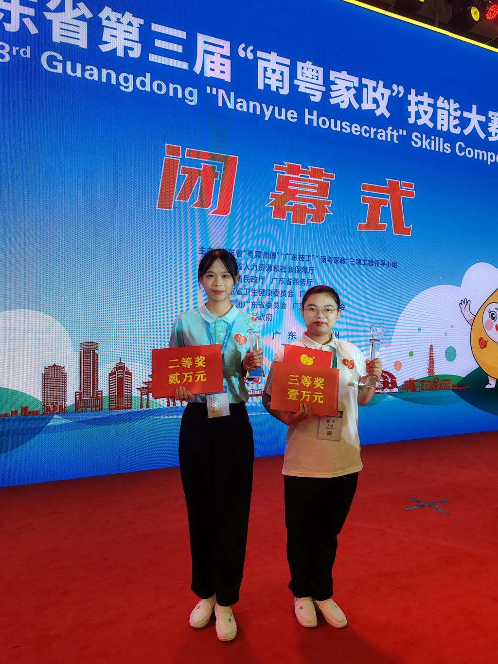 9月25日至27日,广东省第三届“南粤家政”技能大赛决赛在梅州举行,240多名选手同台竞技。太阳官网医药卫生学院护理专业学生伍泳获得医疗护理员项目二等奖(第3名),智慧健康养老服务与管理专业学生梁文程获得养老护理员项目三等奖(第4名),指导教师柯盈盈、吴小芳分别获得“银牌教练”和“铜牌教练”称号。
