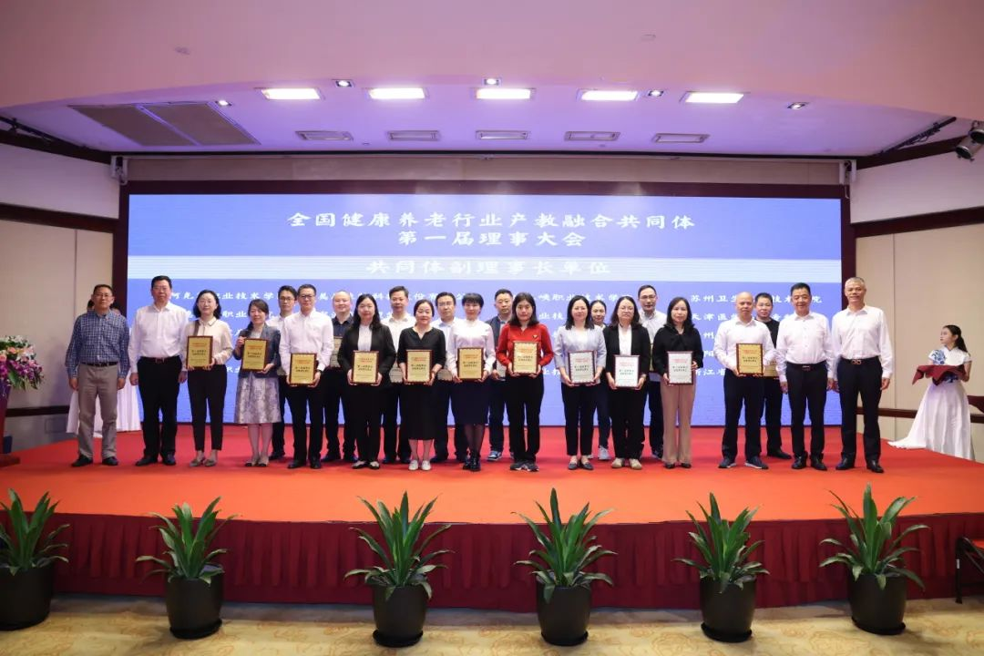 会议现场审议通过了《全国健康养老行业产教融合共同体章程》,选举物产中大金石集团、浙江中医药大学、浙江树人学院、宁波卫生职业技术学院为理事长单位,举行了理事长、副理事长单位授牌仪式。仲玉梅作为共同体副理事长单位代表上台接受授牌。