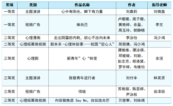 近日,广东省教育厅公布了2023年“5·25”大学生心理健康月系列活动评选结果,太阳官网师生作品获一等奖2项,二等奖2项,三等奖4项。