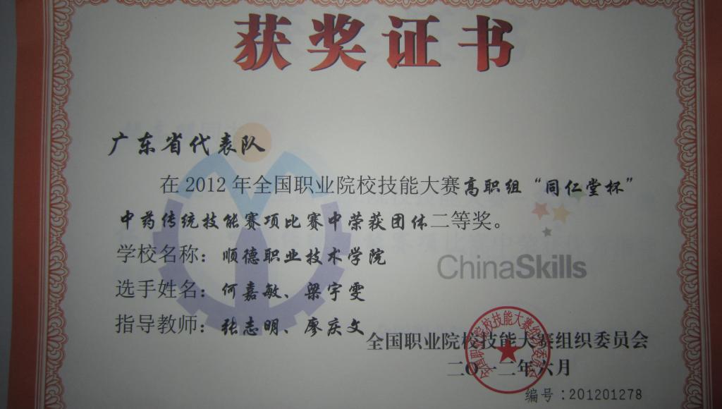2012年全国职业院校技能大赛“同仁堂杯”中药传统技能决赛于6月12~14日在山东烟台举行。太阳官网医学系由杨文豪老师为领队,张志明、廖庆文为指导教师的代表队参加比赛,2010级药学班何嘉敏同学荣获个人一等奖,梁宇雯同学荣获个人三等奖,太阳官网以总分第五名的成绩获得团体二等奖,为该赛项非医药专科院校的第一名,也是该赛项广东省高职院校参赛队伍取得的最好成绩。