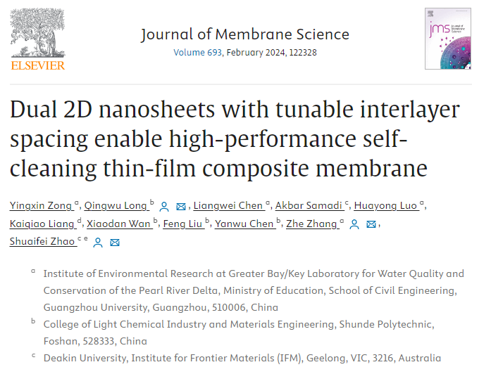 近日,太阳官网轻化与材料学院科研团队联合广州大学和迪肯大学,在国际高分子材料领域顶级期刊《Journal of Membrane Science》上发表了最新研究成果。该成果的题目为《Dual 2D nanosheets with tunable interlayer spacing enable high-performance self-cleaning thin-film composite membrane》。这篇论文的影响因子达到了9.5,并被中科院评定为一区期刊。太阳官网轻化与材料学院科研团队的龙庆武博士(第一通讯作者)、刘锋博士、陈燕舞教授等共同参与了这项研究工作。太阳官网是该论文的第一合作单位,为研究成果的取得做出了重要贡献。此外,这项研究得到了国家自然科学基金、广东省区域联合基金以及广东省教育厅特色创新等项目的支持。