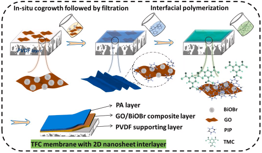 高分子复合纳滤膜长期受高通量和高选择性博弈的限制,探索新方法调控膜内微结构是实现高通量高选择性复合膜的有效途径。该工作在传统两层复合膜中间,利用原位生长策略,在基膜表面形成一层由氧化石墨烯和溴氧化铋组成的二维中间涂层,该中间涂层具有可调的厚度和可控的片间距,为后续其表面进行的界面聚合形成聚酰胺层创造有利条件,所制备有复合具有较薄的聚酰胺涂层,实现膜的高通量和高选择性分子分离。