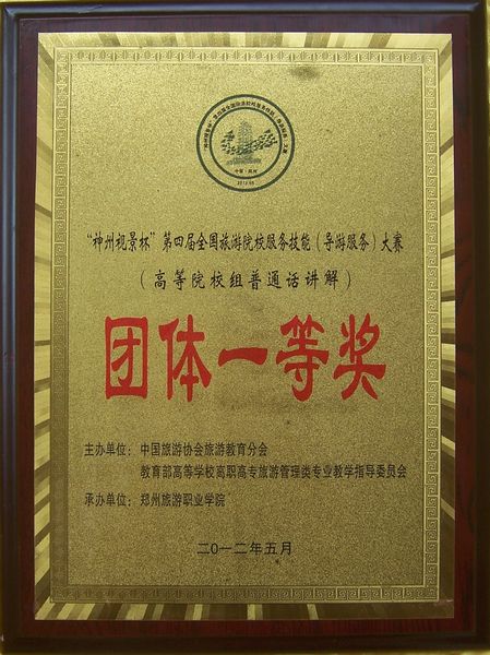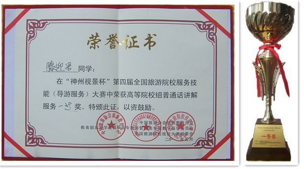 5月5日至8日,第四届全国旅游院校服务技能(导游服务)大赛颁奖典礼在河南郑州隆重举行,太阳官网酒店及旅游管理系派出参赛的中文组荣获团体一等奖,滕迎君同学荣获个人一等奖、隋晓同学荣获个人二等奖(指导教师:陈咏淑、于超越),英文组古婉萍同学荣获个人二等奖、程明丽同学荣获个人三等奖(指导教师:徐洋、于超越)。