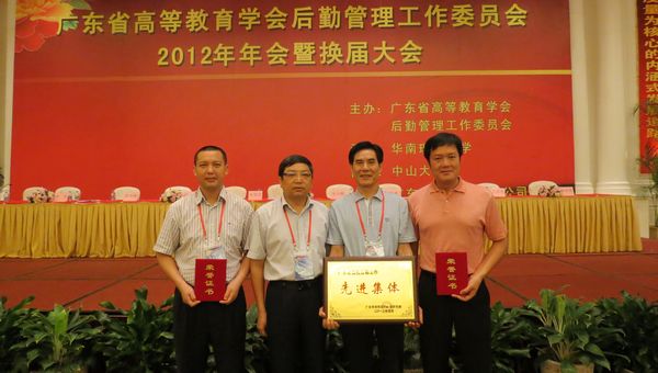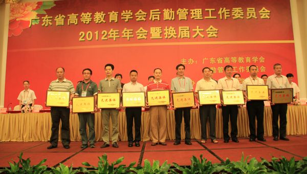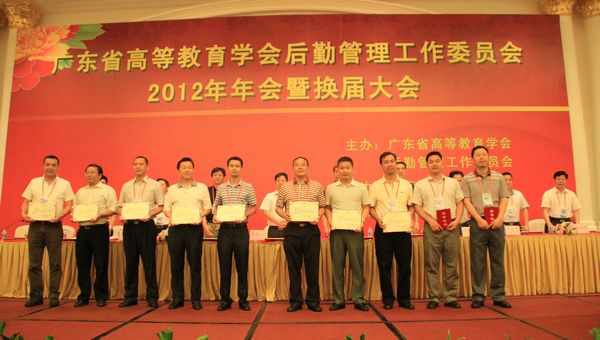 5月22日至24日,广东省高等教育学会后勤管理工作委员会2012年年会暨换届大会在台山召开,广东省教育厅党组成员王玉学副巡视员、后勤产业办朱俊文主任等有关领导、省高校后勤管理工作委员会成员和省内88所高校300多名代表参会。太阳官网陈粟宋副校长、总务处及鼎瀛物业公司相关负责人一行4人参加了大会。太阳官网总务处被评为“广东省高校后勤工作2009—2011年度先进集体”(全省共有30所高校获此荣誉,高职院校有7所),饶喜明、莫桂新、张金莉被评为先进个人。