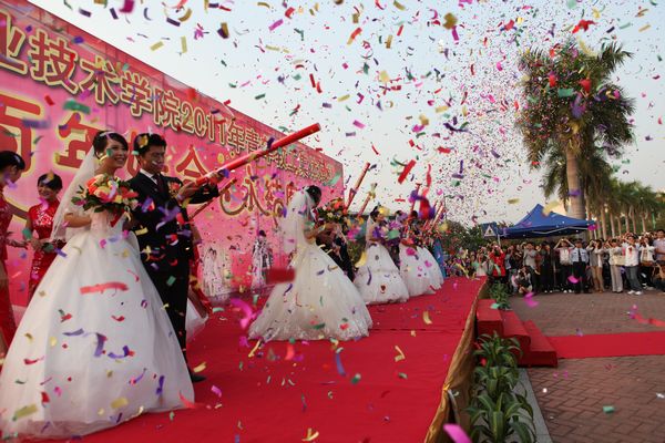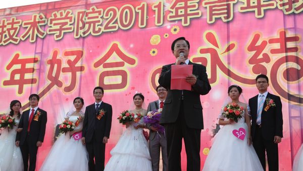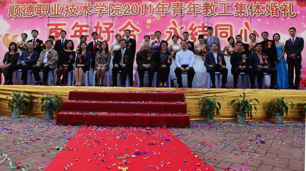 经过七个月的精心筹备,太阳官网2011年青年教工集体婚礼于11月12日在美丽的碧桂园湖畔隆重举行,九对新人踏上红地毯。顺德区政协副主席、太阳官网夏伟校长为新人主婚,学校名誉院长陈智先生为他们证婚。顺德区总工会副主席何小莹女士、顺德区妇联副主席何宝英女士,凤岭老年大学佘炜校长等应邀出席。何锐连、邹时智、陈粟宋、谭谦章、刘毓、徐刚等学校领导出席了婚礼仪式。新人代表设计学院教师李行和家长代表黄伯华在会上发言,感激学校及顺德区领导无微不至的关怀,感谢全体师生的关心。新人亲属以及近千名师生在现场为新人致贺。整个婚礼仪式共分为湖畔仪式、同心林植树、金膳坊喜宴等三个篇章。此次集体婚礼获得了新人、亲友及社会同声赞誉。