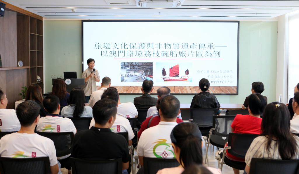 开幕式后,“旅游文化保护与非物质文化遗产传承”大讲堂在图书馆六楼读者活动室举行,澳门造船工艺文化协会会长谈骏业以澳门路环荔枝碗船厂片区为例对有关问题进行了专题讲解。