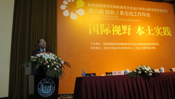 11月12日,由教育部高等学校高职高专艺术设计类专业教学指导委员会主办,同济大学设计艺术研究中心和上海工艺美术职业学院承办的以“国际视野 本土实践”第六届全国高职高专艺术设计类院校院长/系主任工作年会在上海同济大学举行。教育部高教司高职高专处范唯处长、教育部高职高专艺术类专业教指委主任林家阳教授、同济大学副校长陈以一教授、德国波茨坦创意学院院长乌里•温伯格教授、台湾实践大学工业设计系主任朱旭建教授等出席大会。来自全国100多所高职高专艺术设计院系的300名院长、系主任等参加了大会,数千件优秀毕业设计作品和上百名教师参与了竞赛角逐。太阳官网彭亮教授作为本届年会执行主席主持了国际设计论坛,大会还邀请了乌里•温伯格教授、潘家俊教授、朱旭建教授和林家阳教授分别进行主题发言。