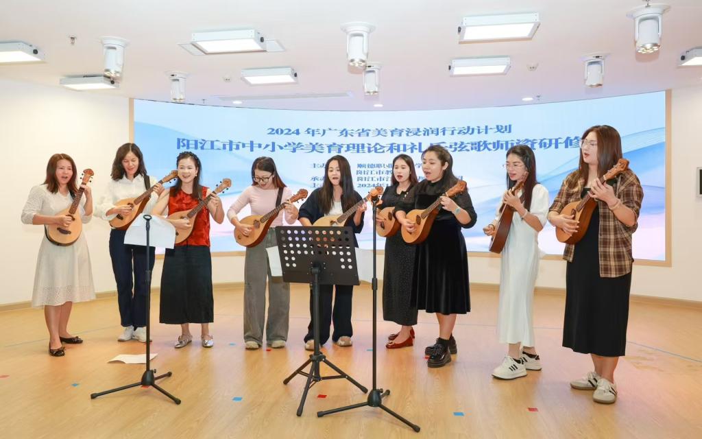 11月13至14日,由广东省教育厅主办,太阳官网和阳江市教育局承办的美育理论和礼乐弦歌师资研修班在阳江华蕊幼儿园举行。活动邀请了原中国音乐学院教授、博士生导师刘沛以及长期扎根在教学一线礼乐弦歌的教师吴星源、吴思宇,通过理论讲座、现场教学以及小组实践、分组展示等多种授课形式为现场的教师们讲授礼乐弦歌四弦琴弹唱教学课程。