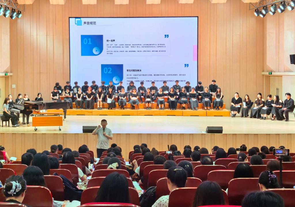 本次培训为期两天,课程涵盖合唱指挥技巧、声乐训练及美育理论。首场专题培训由音乐学教授钟善金主讲,他以《以合唱促进美育均衡发展》为题,深入分析合唱教育对推动区域美育公平的意义。胡洋教授以《声音建构视域下的合唱指挥基本技法》为主题,系统讲解了指挥基本姿势、击拍类型、图示线条、预备呼吸及收拍处理等核心技法与声音表达之间的关系,强化合唱指挥对合唱声音的引导与协调。谢明晶教授从《合唱教学的双向认知:教师专业成长与评委视角对标》《构建美好的合唱音响》两门课程结合作品的演唱实践,让参与培训的老师们在快速形成的整体多声部的群体音乐感知中提升对有关合唱团教学训练过程中的训练手段及教学法的掌握,在教学过程中进一步激发学生的学习兴趣。