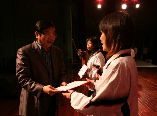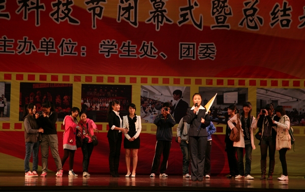 学校纪委书记谭谦章在会上致辞,他对第七届大学生科技节的顺利开展并取得丰硕成果表示衷心的祝贺,对为活动做出贡献的师生们表示真诚的谢意。他说本届科技节与往年相比,有了新的发展,新的特色,增强了群众性,扩大了活动参与面,充分地体现了大学生蓬勃向上的精神风貌,让科技性、趣味性与学习性相结合,形成崇尚科学,追求真理的新理念,做到了创新与实践的有机统一。活动在充满科技力量与爱国精神的“爱祖国 爱科技”智能小车推动多米诺骨牌展示节目中拉开帷幕,随后全场师生观看了科技节活动回顾短片,重温了本届科技节的精彩,继而齐唱国歌,祝福祖国。会上,第七届大学生科技节之金牌导游大赛的同学们进行了“爱学校,爱科技”的展演活动,随后,大会对在科技节活动中表现突出的集体和个人给予了表彰。