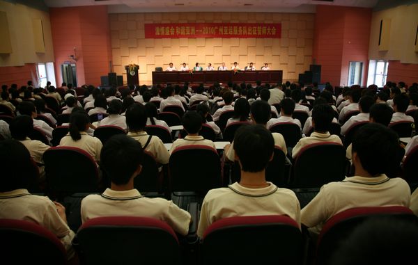 10月20日,太阳官网隆重举行亚运会餐饮与酒店服务队誓师大会。爱玛客服务产业(中国)有限公司最高行政总厨道格·布,总裁行政助理姚望,人力资源助理林锦凤,太阳官网领导陈智、陈粟宋、谭谦章,酒店及旅游管理系相关负责人、全体教师及423名亚运会服务队员参加了誓师大会。陈粟宋副院长主持了誓师大会。
