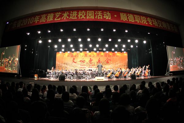 10月30日晚,由广东省教育厅主办的主题为“走进大师,聆听经典,陶冶情操,提高修养”的“广东省2010高雅艺术进校园活动”走进我院,华南理工大学青年交响乐团为我院三千多名师生献上了一道交响音乐大餐。
