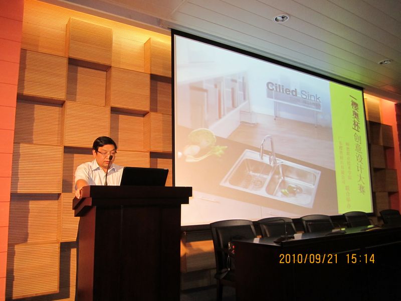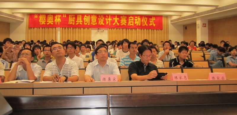 广东樱奥厨具有限公司的生产部经理邵秀甜从樱奥厨具公司的发展历史导入,为大家做了全面的赛事介绍,包括设计作品的要求、竞赛程序和操作细节等。陈家乐总监就同学们感兴趣的问题与大家进行了现场交流和互动。陈家志总经理鼓励师生踊跃参与本次大赛,并对大家的创意性设计表示了期待和欢迎。