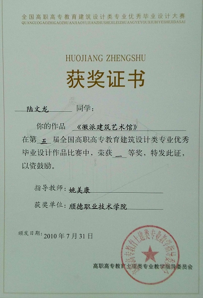 会议期间,举行了2010年优秀毕业设计大赛,我院选送的9幅作品全部获奖,其中陆文龙同学的“徽派建筑艺术馆”荣获建筑设计一等奖(共设三个一等奖)。另外,分别由姚美康、卢伟成、周彝馨、张俊竹、汤强等老师指导的设计作品,还获得了二等奖两项,三等奖四项,优秀奖两项,获奖数量和级别,在40余所参赛院校中名列前茅。