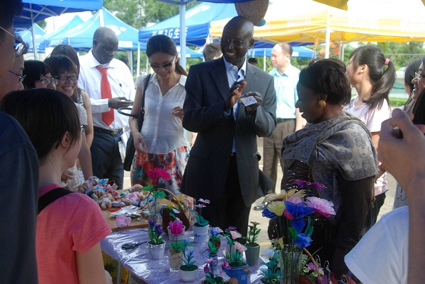 展会现场,很多同学和老师都过来参观和购买一些适合的商品,并观看现场的一些活动,24日下午,何锐连副院长带马里非洲团结正义党代表团外宾参观校园,巧遇会展现场活动,他们饶有兴趣的去现场参观指导,外国客人还高兴地购买了一些小商品,并对活动给予了高度评价。