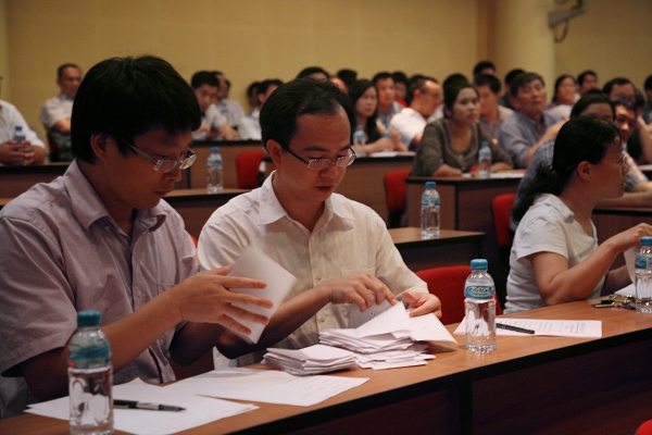 夏伟院长在会上作重要讲话。他要求评议组成员和部门教职员工要从学院改革和发展的大局出发,认真对待,以高度的责任感和客观公正的态度投出自己手中的一票;同时他还要求工作人员当场统计并公布应到、实到人数及选票的发放回收情况,以充分体现我院以“科学的制度、民主的方法、严密的程序、严格的纪律”选拔优秀人才的指导思想和原则,确实做到公平、公正、公开、透明。