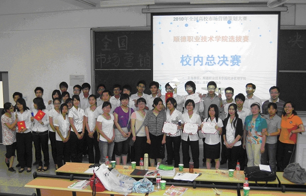 5月26日下午,由经济管理学院主办,市场营销协会承办的2010全国高校市场营销策划大赛顺德职院校内选赛决赛隆重举行。经济管理学院领导出席了本次活动,市场营销专业教师担任大赛评委,来自黑龙江佳木斯职业技术学院交流的三位老师及经管学院部分老师、学生近200人参加了本次比赛。