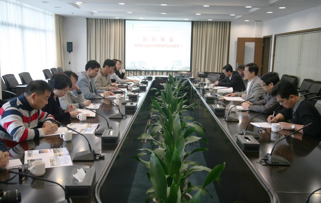 4月27日,温州职业技术学院丁金昌院长一行10人来太阳官网参观交流。太阳官网领导夏伟、陈粟宋、刘毓、徐刚及部分中层干部热情接待了来宾。
