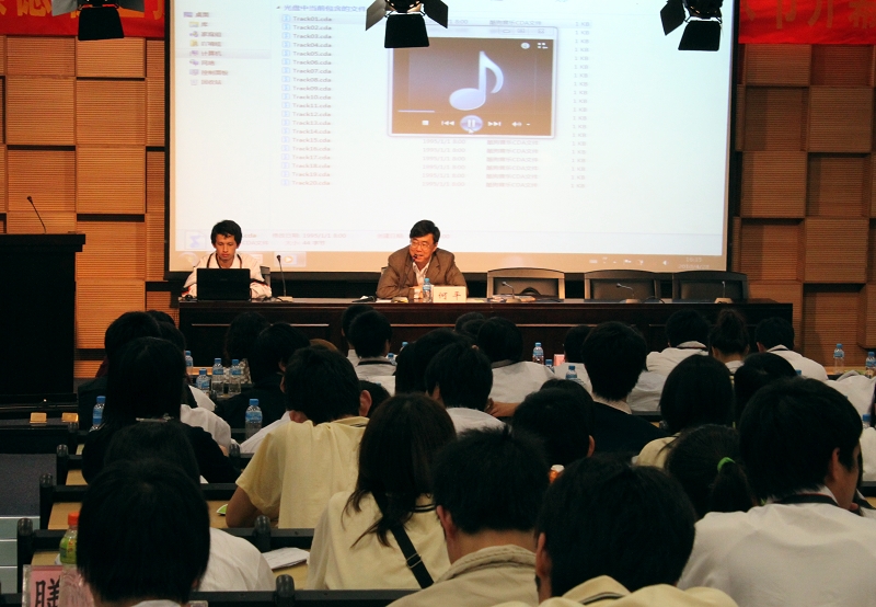 开幕式结束后,邀请广东省音乐家协会副主席、华南理工大学艺术学院院长何平教授给师生们做主题为“中国民歌风格谈”的音乐讲座。何平教授深入浅出地对不同地域、不同色彩区的民歌风格进行了讲解,并引导大家欣赏了山歌、号子、小调等不同音乐样式的民族歌曲。