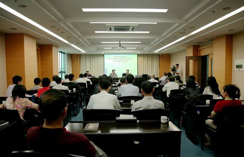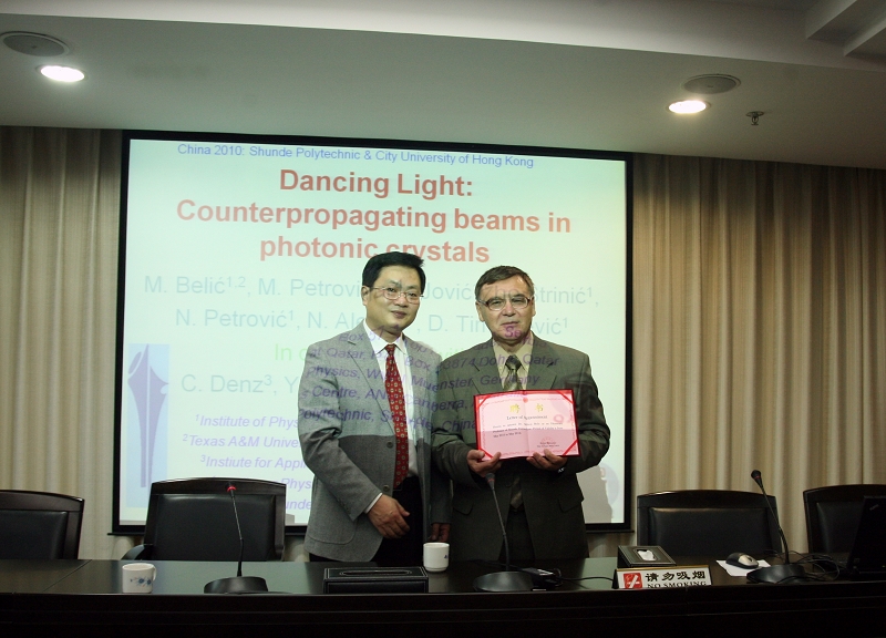 太阳官网领导夏伟院长及邹时智副院长热情接待了来访客人,夏伟院长向米利沃吉·贝利克博士颁发了荣誉教授证书。学院办公室、党委宣传部、科技处、电子工程系等部门领导和工作人员参加了接待。之后,米利沃吉·贝利克博士向太阳官网教师做了题为《舞动的光:反向光束在光折变材料和光子晶体中的传播》的学术报告。