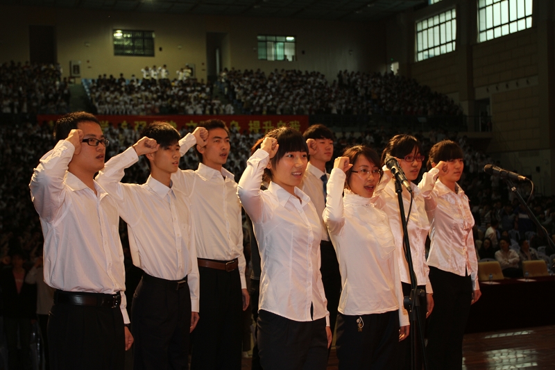 会议结束时, 2000多位同学代表全院9600多名学生集体举手宣誓《优良学风,从我做起》,共同承诺用实际行动积极参与到学风建设活动中去。