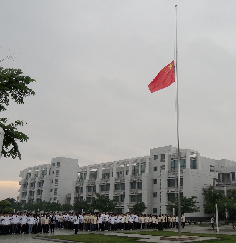 4月21日早上,阴雨绵绵,天色黯淡,校团委组织全校近千名师生身着素衣,聚集在图书馆文化广场前一起肃立默哀,沉痛哀悼玉树地震遇难同胞。出席默哀活动有校团委张业华副书记、外语系陈春艳书记、辅导员、外语系全体学生及各系(院)团员骨干近千人。7时28分,师生们面朝国旗方向,神情肃穆,低头为玉树大地震遇难同胞默哀。路上来往的行人也低头驻足致哀。师生们沉浸在巨大的悲痛中,部分同学忍不住低声哭泣。