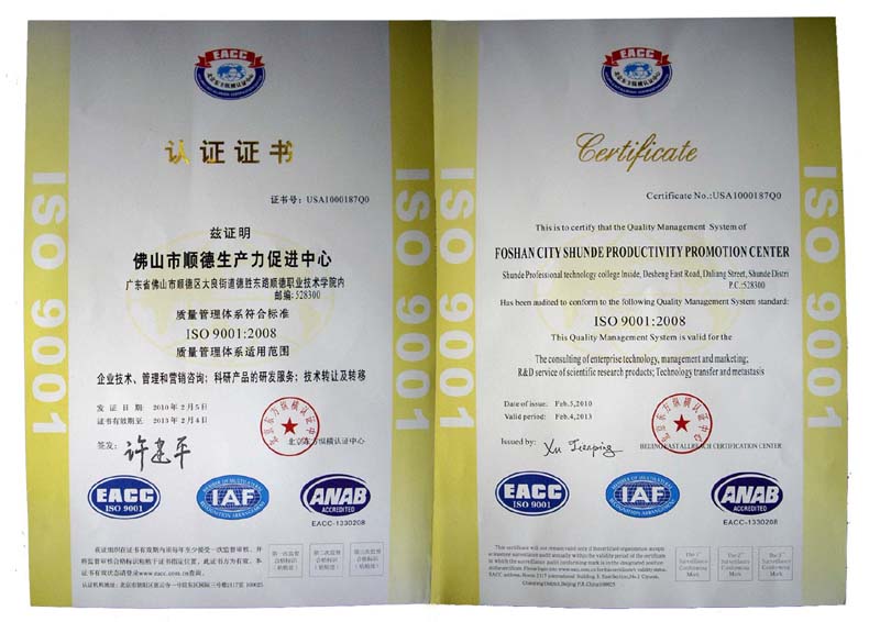 多年来,顺德生产力促进中心坚持把服务质量放在首位,严格按照《IS09001:2008质量管理体系》和《SZ/T1-2001生产力促进中心服务业务规范》为企业开展服务工作,不断提高管理水平。本次质量体系认证的通过,标志着中心内部管理达到了一个新的水平,而且对于今后规范、持续改进各项工作乃至长远发展都具有极大的促进作用。