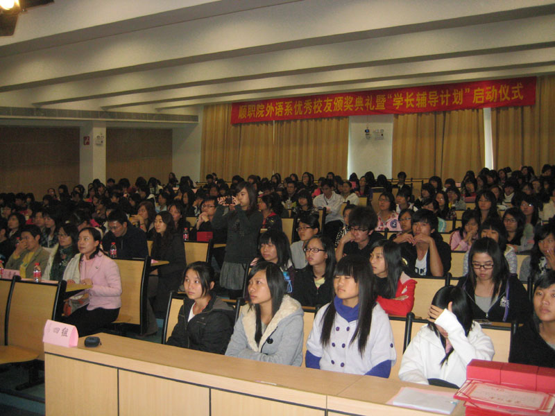 12月4日,外语系“校庆活动月”系列活动之——外语系优秀校友颁奖典礼暨“学长辅导计划”启动仪式在学生报告厅举行。罗勇武副院长,卢伟成副处长,外语系宁顺青主任、陈春艳书记、杨爱国副主任及外语系部分老师、校友,全体09级学生参加了本次活动。