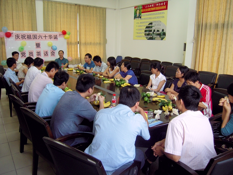 随后,在电子工程系会议室举行了“庆祝祖国六十华诞暨党员茶话会”。石玉财书记在会上发言,希望各位党员通过此次活动,增强爱国情感和爱党热情,结合《珠江三角洲地区改革发展规划纲要》中关于建立职业教育体系对我们提出的要求,发挥出党员先锋模范作用。各位党员也各抒己见,谈了自己的感悟和体会,并表示要在自己的工作岗位上兢兢业业,为学校的发展尽自己的力量。