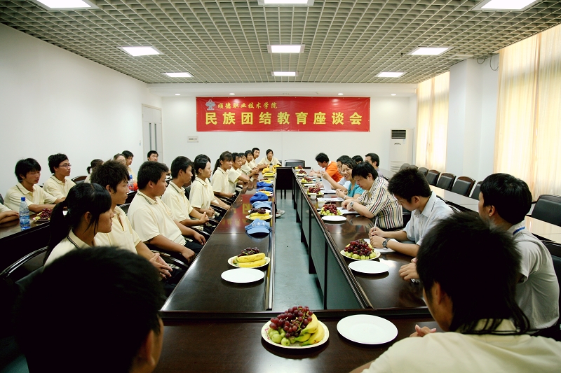 在新中国60周年华诞即将来临之际,9月26日上午,学校召开民族团结教育座谈会,校领导陈粟宋、谭谦章,党委宣传部部长刘晓顺、学生处副处长周发兴、教务处副处长卢伟成和来自回族、满族、蒙古族、苗族、仫佬族、土家族、壮族、汉族等8个民族的学生代表20余人欢聚一堂,畅谈励志成才、共享中秋欢乐、共话民族团结、同祝祖国昌盛。学生处处长陈曦主持了座谈会。