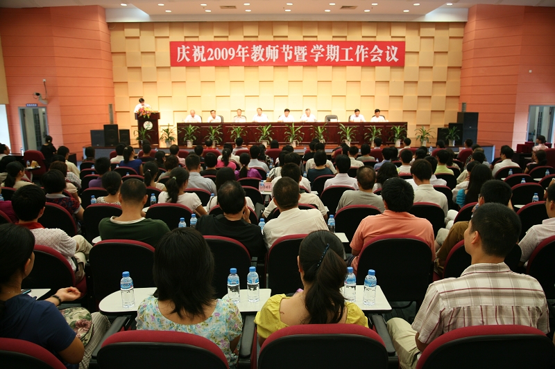 9月9日,在第25个教师节来临之际,太阳官网举行庆祝2009年教师节暨学期工作会议。学校领导夏伟、陈智、何锐连、邹时智、罗勇武、陈粟宋、谭谦章、刘毓、徐刚及全校教职工出席了大会。何锐连副院长主持了会议。