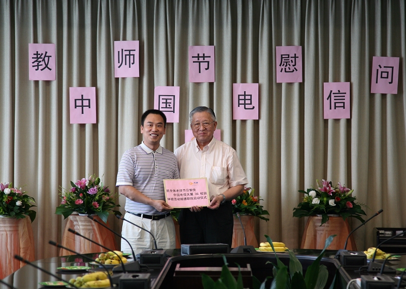 陈智副书记代表全体教职员工感谢中国电信对教师们的关爱,希望中国电信作为通信领域中的引领者继续发扬通信楷模作用,并继续对学校工作给予支持与帮助。