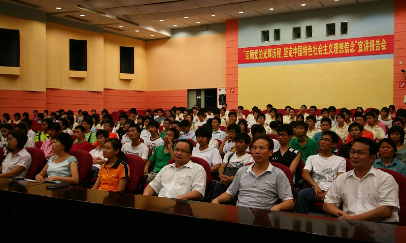 7月8日晚,太阳官网在学术交流中心一楼报告厅组织召开了“回顾党的光辉历程,坚定中国特色社会主义理想信念”宣讲报告会。报告会由思想政治理论课教学部汤恺副教授主讲,党委宣传部刘晓顺部长、学生处陈曦处长,思想政治理论课教学部、学生处、党委宣传部相关教师及各院系近300名学生党员参加了报告会。