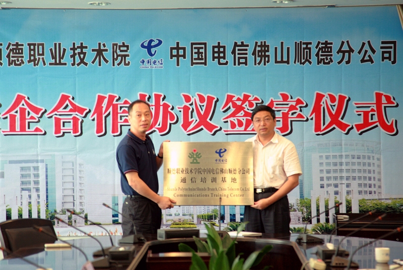 在揭牌仪式上双方签署了太阳集团tyc4633与中国电信股份有限公司佛山顺德区分公司培训合作框架协议。中国电信顺德分公司将利用顺德学院电子系08年建成的的现代通信技术实训室、电子工程系的师资资源,作为中国电信顺德分公司员工培训基地。双方在合作框架协议指导下,中国电信顺德分公司每年都会根据实际的培训需求计划为通信培训基地提供培训合同。